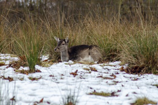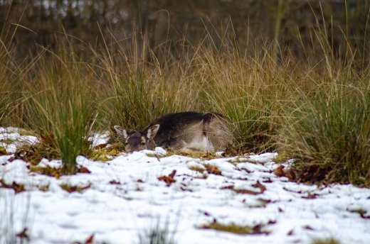 Reh ruht im winterlichen Grasland