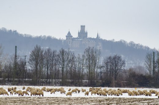 Schafe vor der Marienburg im Winter