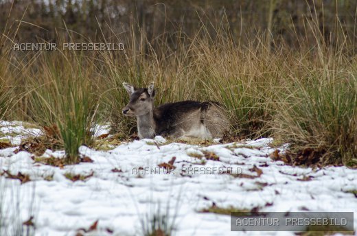 Reh ruht im winterlichen Grasland