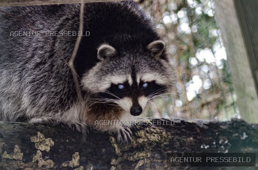 Waschbär blickt aus dem Gehege