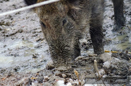 Wildschwein im matschigen Gehege