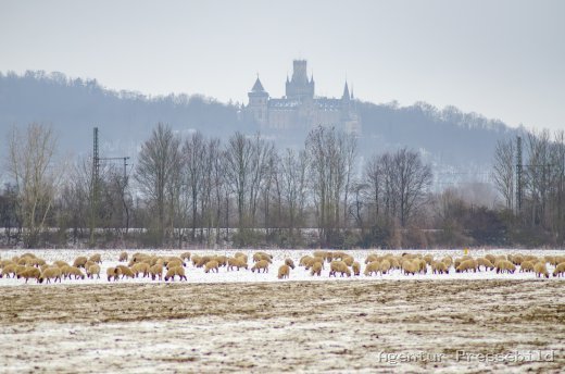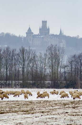 Schafe vor der Marienburg im Winter