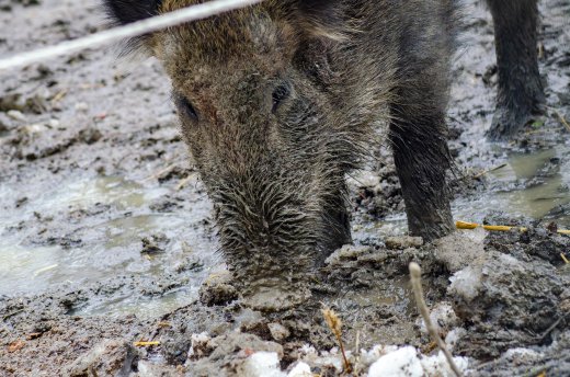 Wildschwein im matschigen Gehege