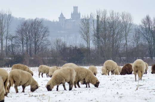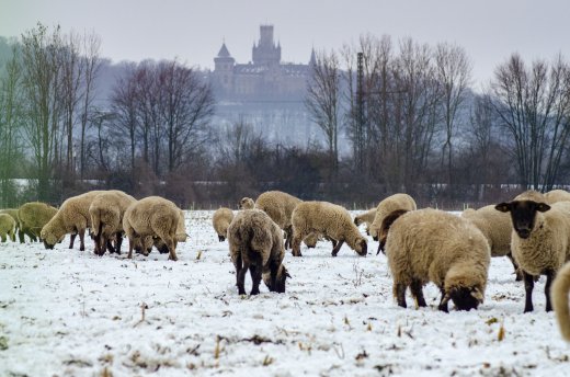 Schafe vor der Marienburg im Winter